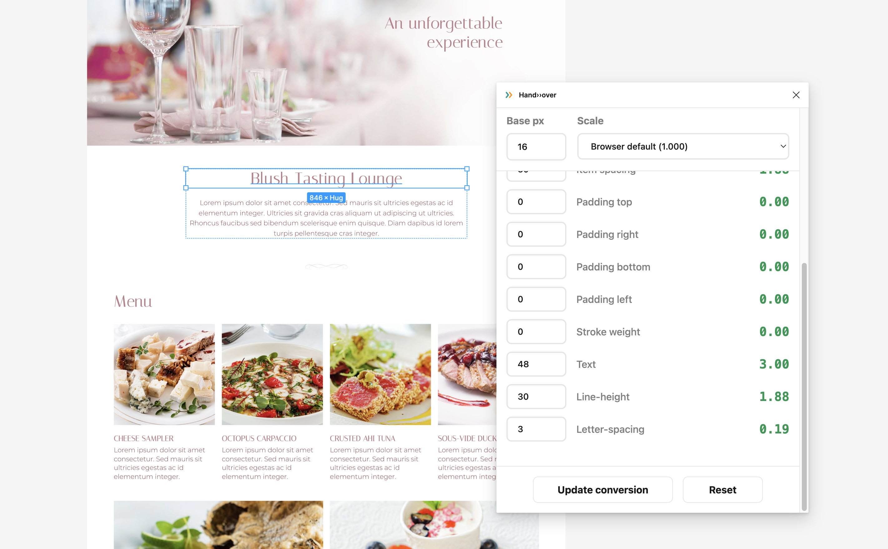 A challenge I ran into during the process was figuring out how to convert between the pixel values used in the Figma document, to the rem units which I was using in CSS. Initially I was converting between the units by searching the values up in Google, however I quickly realized that it was inefficient to do them one by one. I ended up finding a Figma plugin called Hand>>over which was able to convert values upon selecting the specific layers in Figma, which helped with the process. This project definitely opened my eyes to one of many potential challenges that can come up during handoff from design to development.