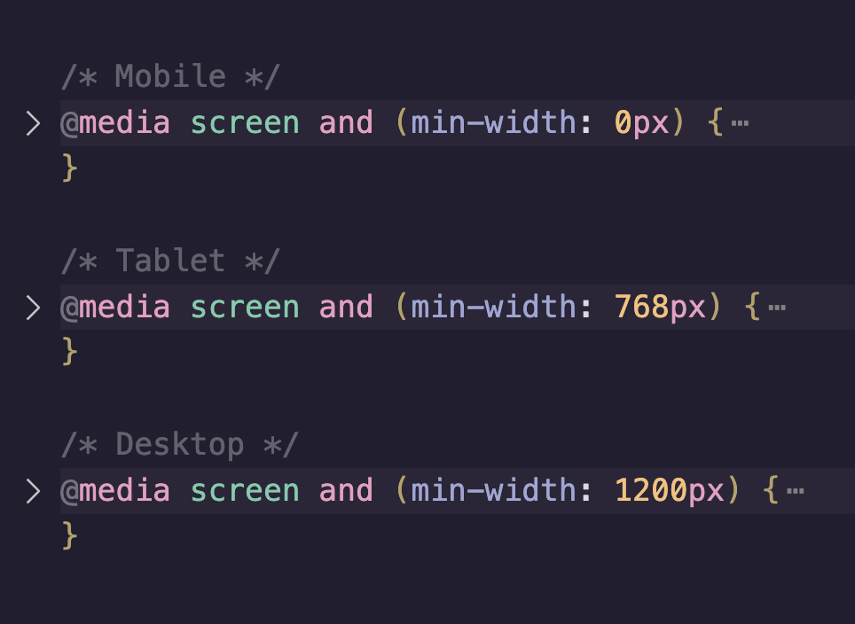 The HTML structure was organized to ensure each section's content would be wrapped in a grid to keep the layout organized. Three separate media queries were used for each of the 3 device sizes: the mobile media query was given a min-width: 0px; , tablet a min-width: 768px; , and desktop a min-width: 1200px.