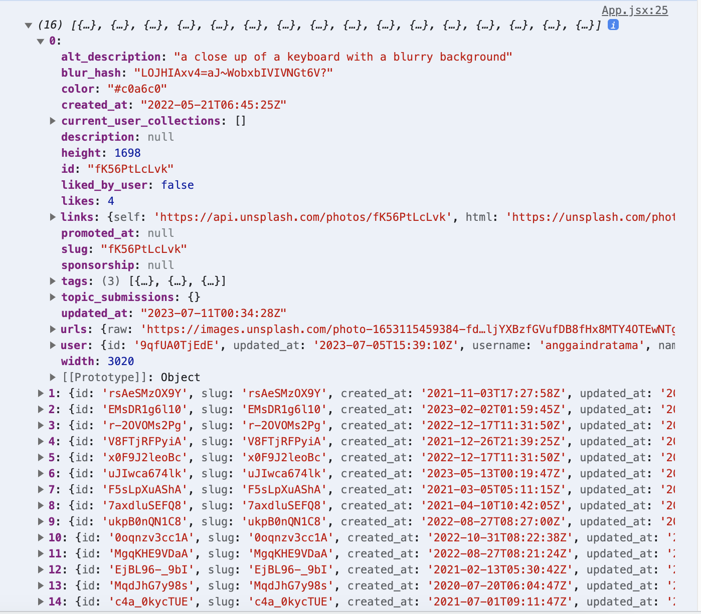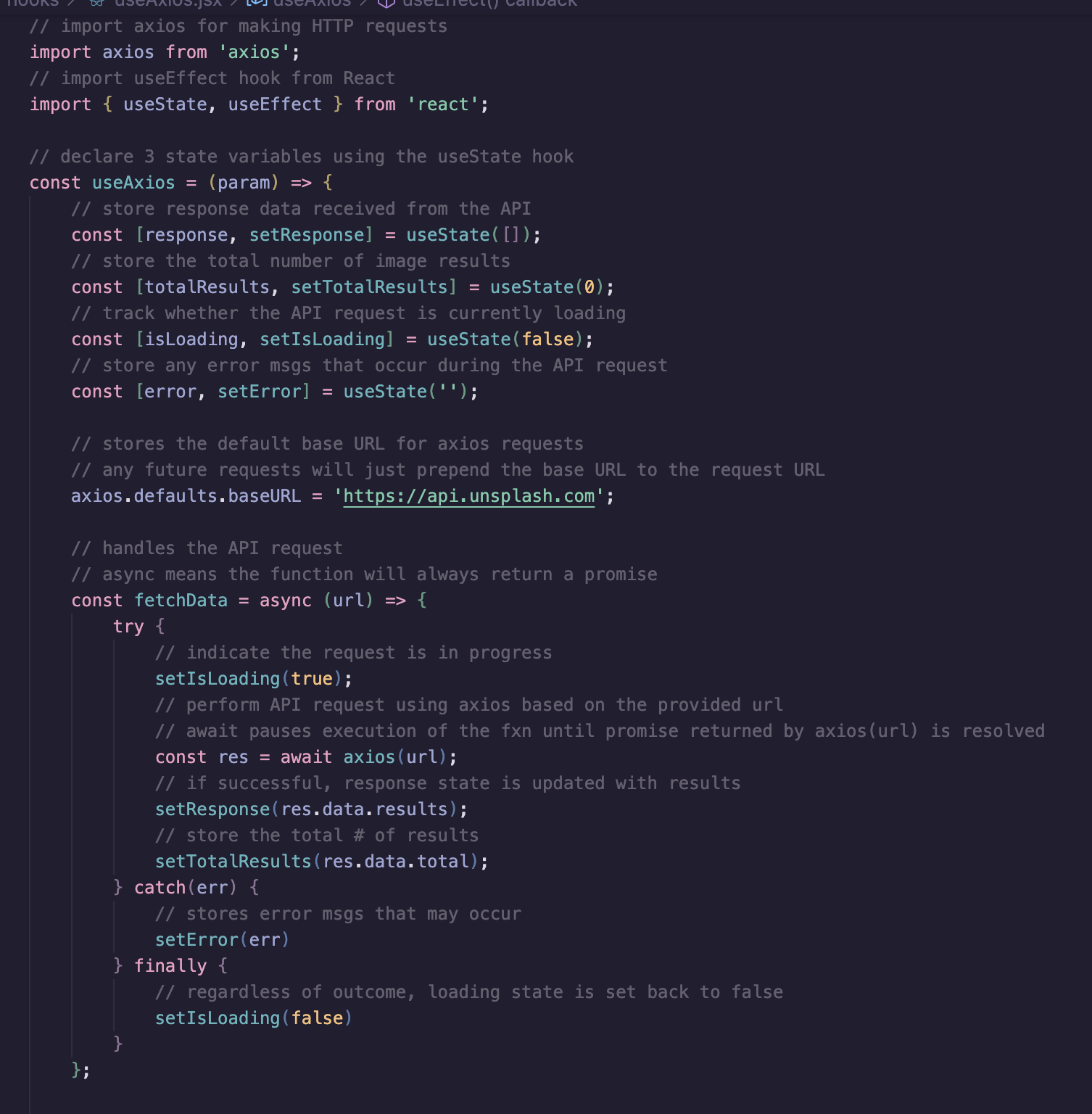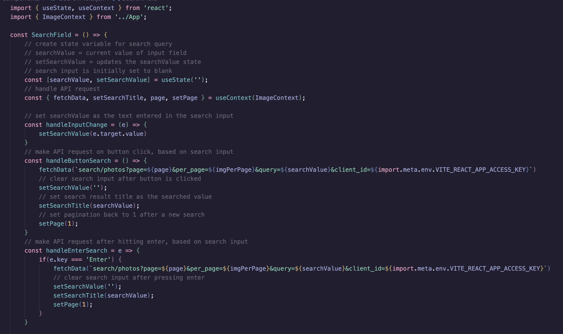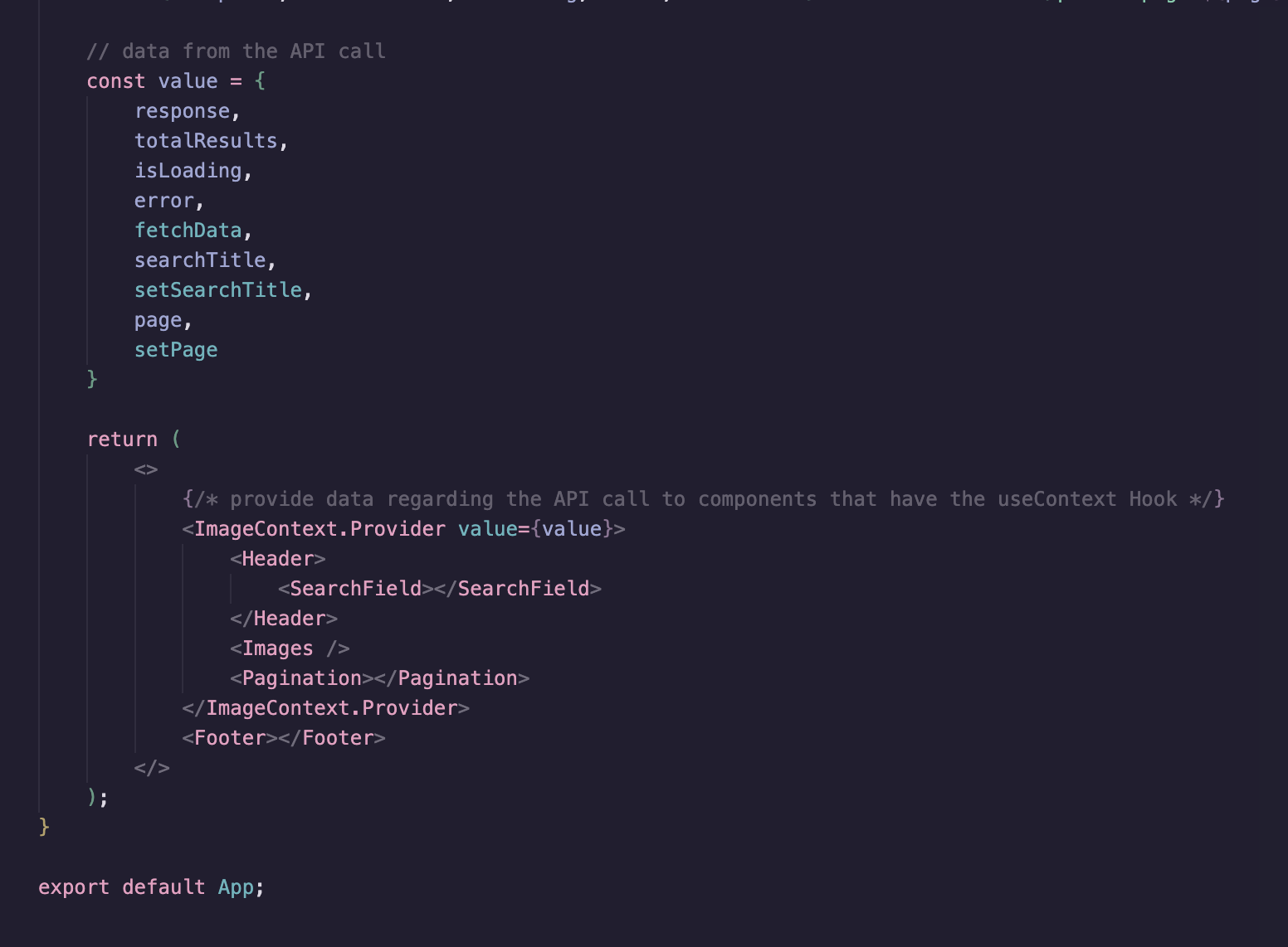 Next, I used context so that the API request data would be accessible to different components. I started by creating a context called ImageContext, and used the useContext hook to indicate that the API response and loading status should be available to the image container. I then provided the ImageContext to the image container component from App.jsx, and then used the map() function to iterate over the response array and display the image gallery. A skeleton component was also created so that a placeholder would display before images were loaded.
