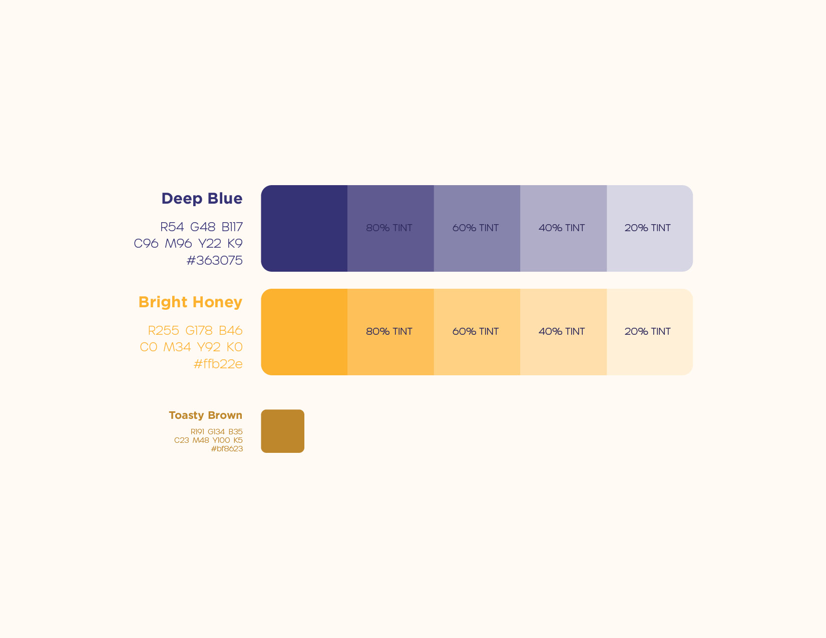 The primary brand colours are composed of a warm-cool colour combination. The deep blue colour signifies the trust and reliability that customers can expect from the family business. The bright honey colour represents the warm hospitality and energy that customers will feel when visiting. The secondary toasty brown colour is a shade derived from the bright honey colour, used for text legibility on the branded packaging.