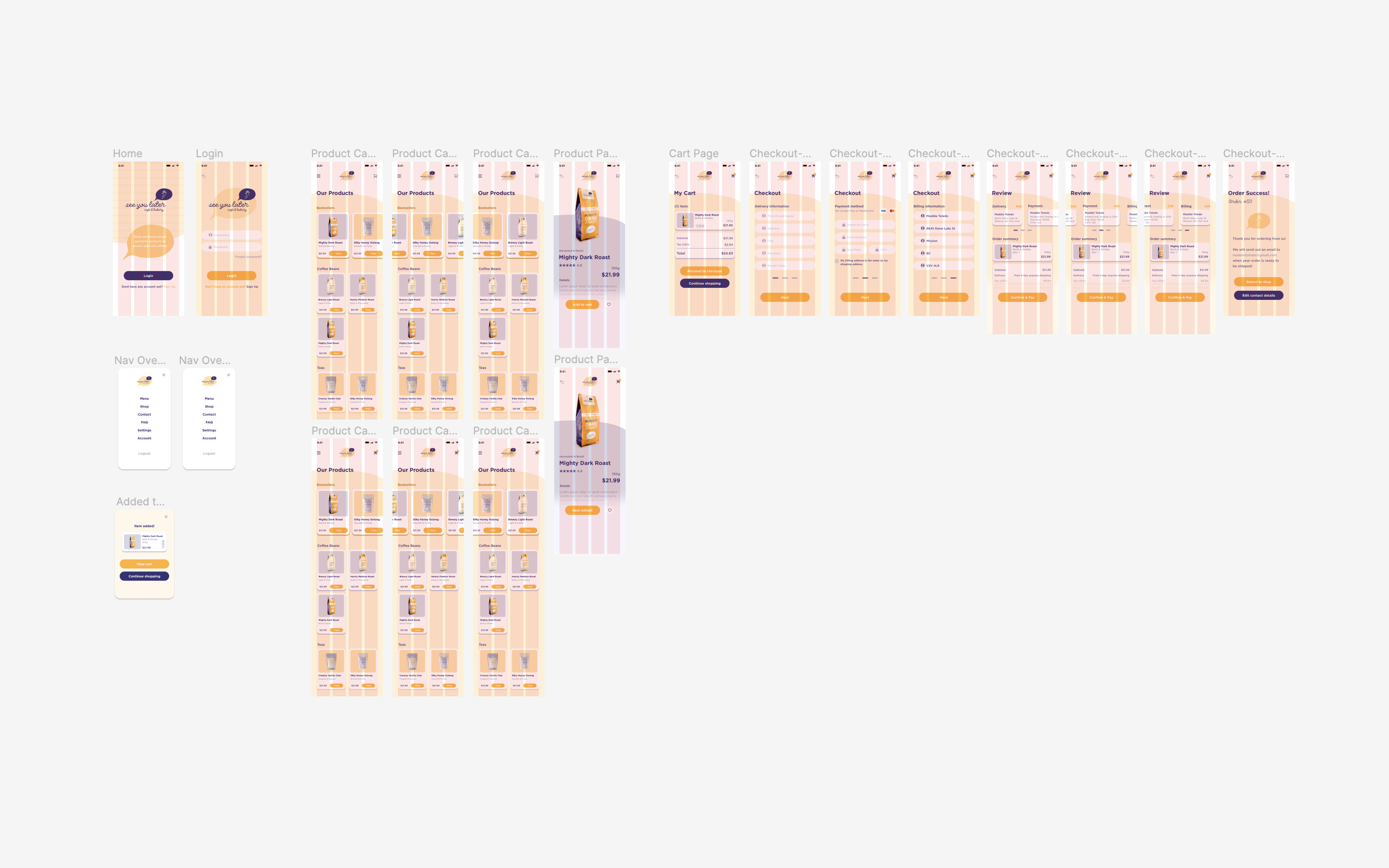 The visual identities for the brand were used when creating the mobile prototype in Figma. The packaging mockups were incorporated into the design as the products. The prototype was designed using a 4-column grid, and an emphasis was placed on creating a clean, simple, and fun interface.