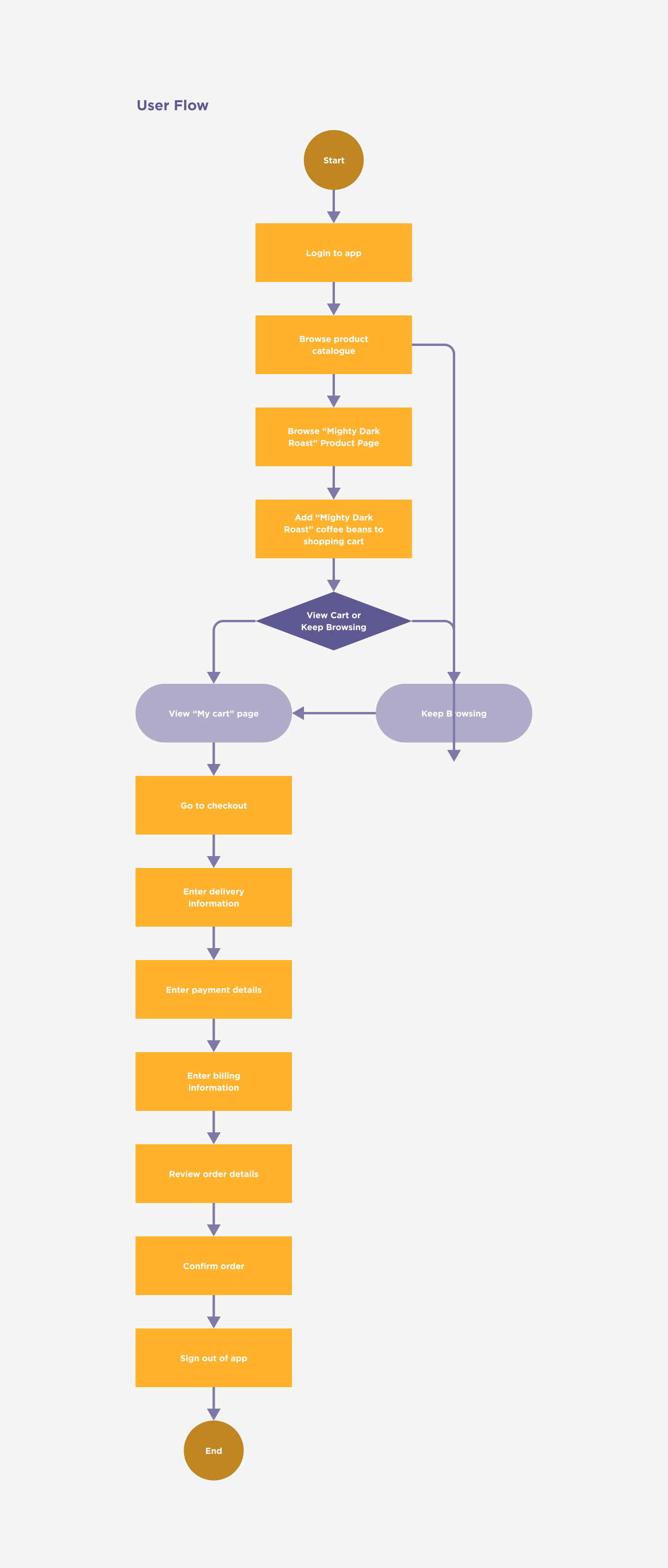 A user persona, user scenario, and user flow were created to empathize with an audience that would have a need for the mobile app. The scenario was based on a local coffee drinker who wants to purchase coffee beans from the shop virtually, and a user flow was included to map out the steps required for the process.